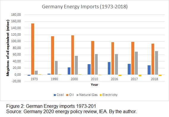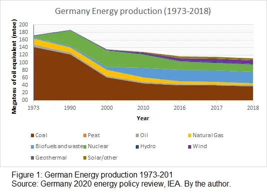 The EU has committed to become an example of a low-carbon economy, as it is clear by the initiative of the EU Green Deal (European Commission, n.d.). Germany is one of the countries that are at the forefront bloc’s environmental initiatives (Goldthau, 2016, page 12) as shown in its commitment to make the economy carbon-neutral, phase out coal and nuclear as energy sources, and make the country more reliant on domestic, renewable energy by 2050. This set of policy goals is known as the Energy transition or Energiewende and, to achieve them, Germany has divested itself of its main domestic sources of energy production: coal and nuclear power. Germany's energy production from 1990 to 2018, measured in megatons of oil equivalent (mtoe), has declined for all types except renewables such as solar, wind, and geothermal (IEA, 2020, page 215) as seen in Figure 1. This is mainly due to the phase-out of nuclear and coal-fired power plants, with nuclear expected to be phased out by 2022 and coal by the end of the 2030s at latest (Edwardes-Evans, 2020).