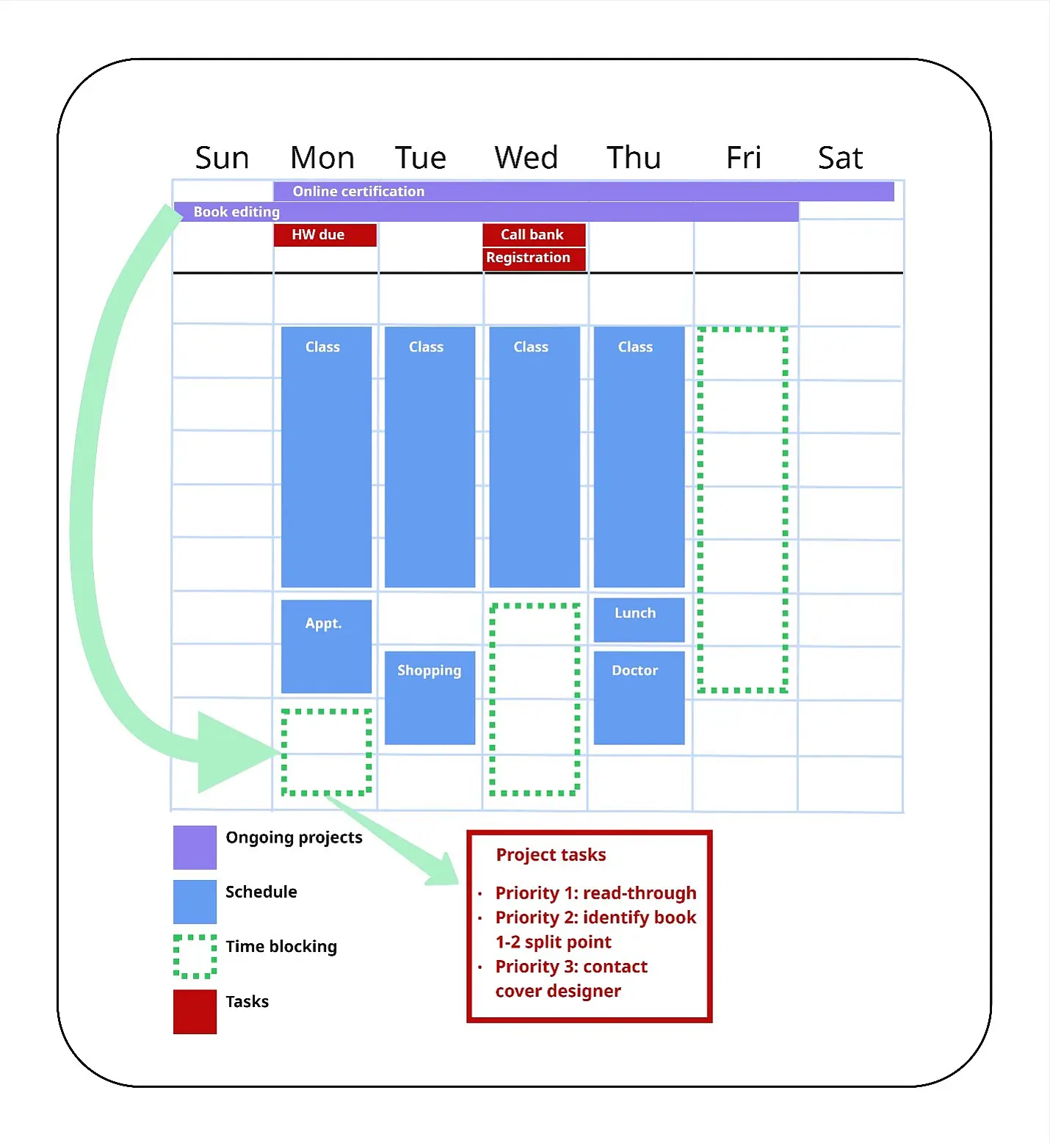 Time blocks (green, dotted line) are where I have free time. This is where I work on the things that need to get done for various projects/classes. I either pick from one of the projects at the top or one of the other things I know are ongoing.